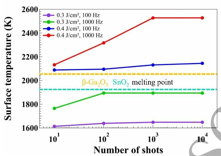 图 5 多脉冲辐照下的表面温度变化结果:0.3 J/cm2、100 Hz(紫色),0.3 J/cm2、1000 Hz(绿色),0.4 J/cm2、100 Hz(蓝色),0.4 J/cm2、1000 Hz(红色)。虚线分别为 β-Ga2O3(橙色)和SnO2(蓝绿色)的熔点。