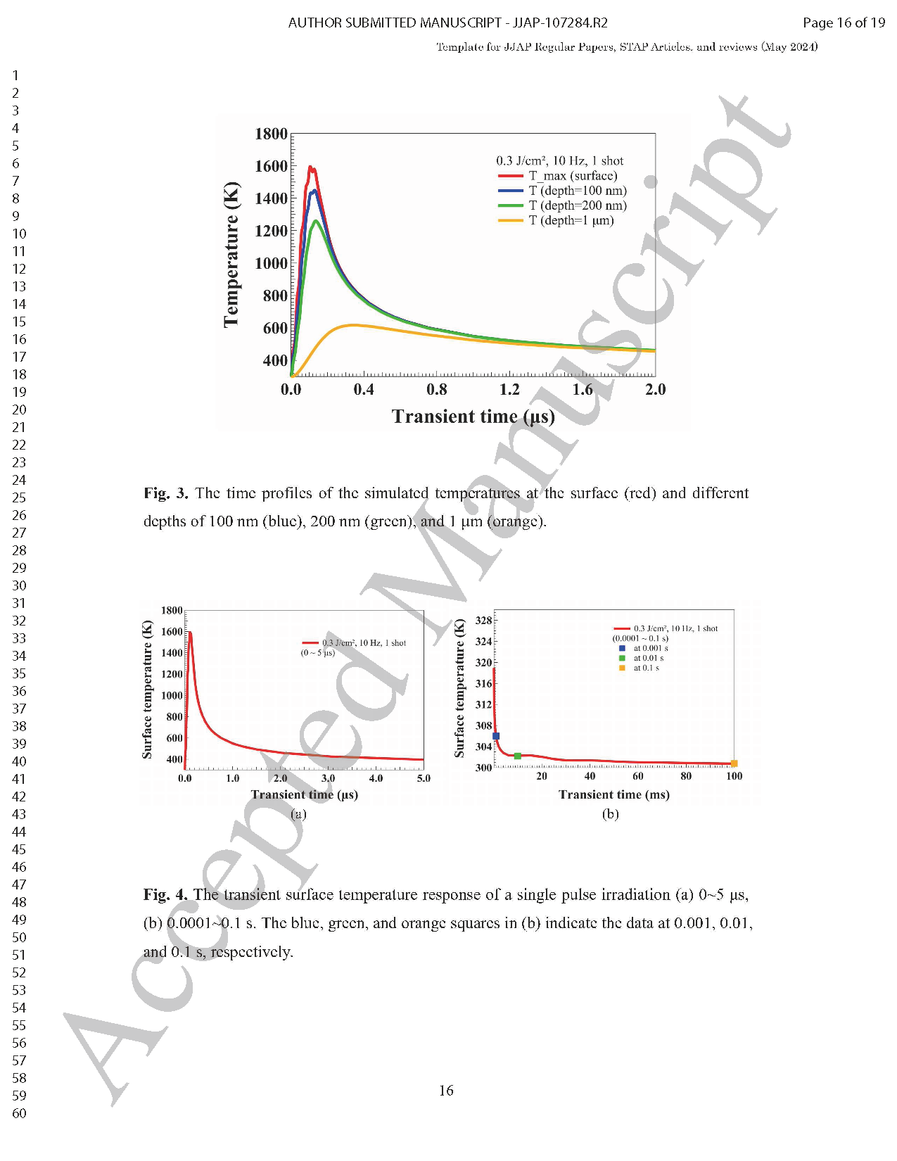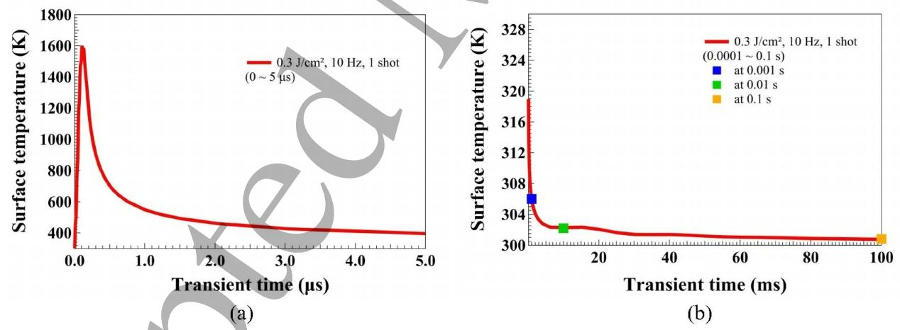 图 4 单脉冲辐照下的表面瞬态温度响应 (a) 0~5 微秒,(b) 0.0001~0.1 秒。图 (b) 中蓝色、绿色、橙色方块分别为 0.001 秒、0.01 秒、0.1 秒时刻的测试数据