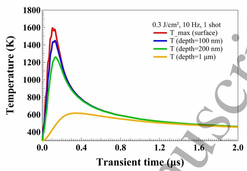 图3 样品表面(红色)及100 nm(蓝色)、200 nm(绿色)、1 μm(橙色)不同深度处的仿真温度随时间变化曲线