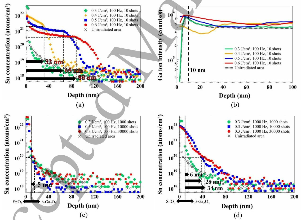 图 6 不同条件下深紫外激光辐照实现 Sn 掺杂 β-Ga2O3的二次离子质谱深度分布曲线:(a) 重复频率 100 Hz、脉冲数 10 次时不同激光通量(0.3、0.4、0.5、0.6 J/cm2)的对比;(b) 重复频率 100 Hz、脉冲数 10 次时不同激光通量(0.3、0.4、0.5、0.6 J/cm2)下镓离子的强度变化;(c) 激光通量 0.3 J/cm2、重复频率 100 Hz 时不同脉冲数(1000、10000、30000 次)的对比;(d) 激光通量 0.3 J/cm2、重复频率 1000 Hz 时不同脉冲数(1000、10000、30000 次)的对比。