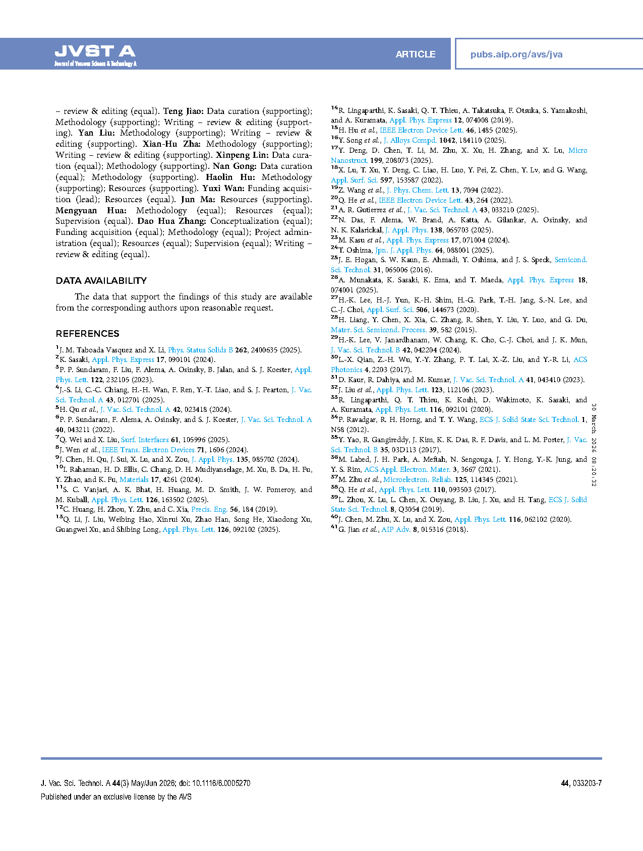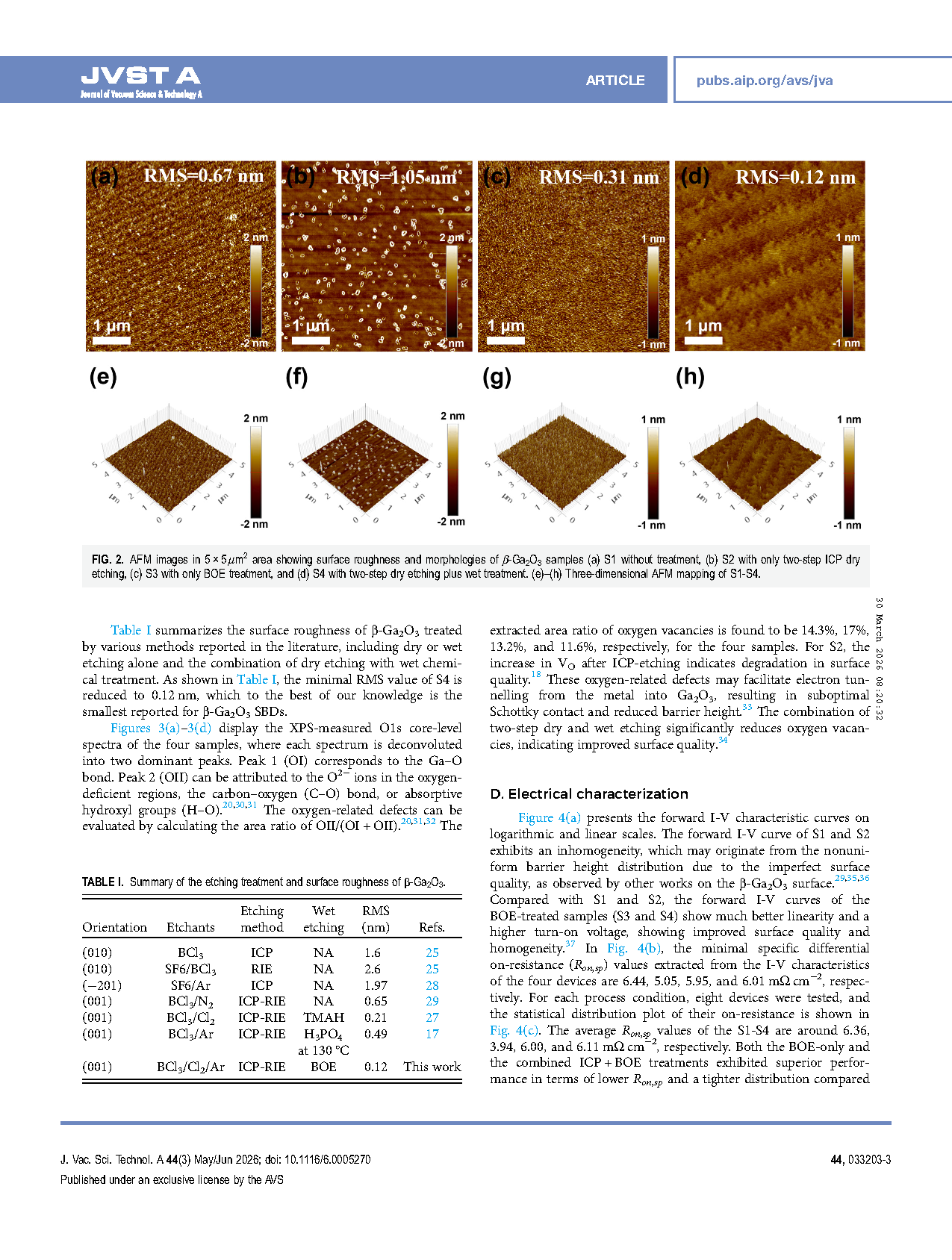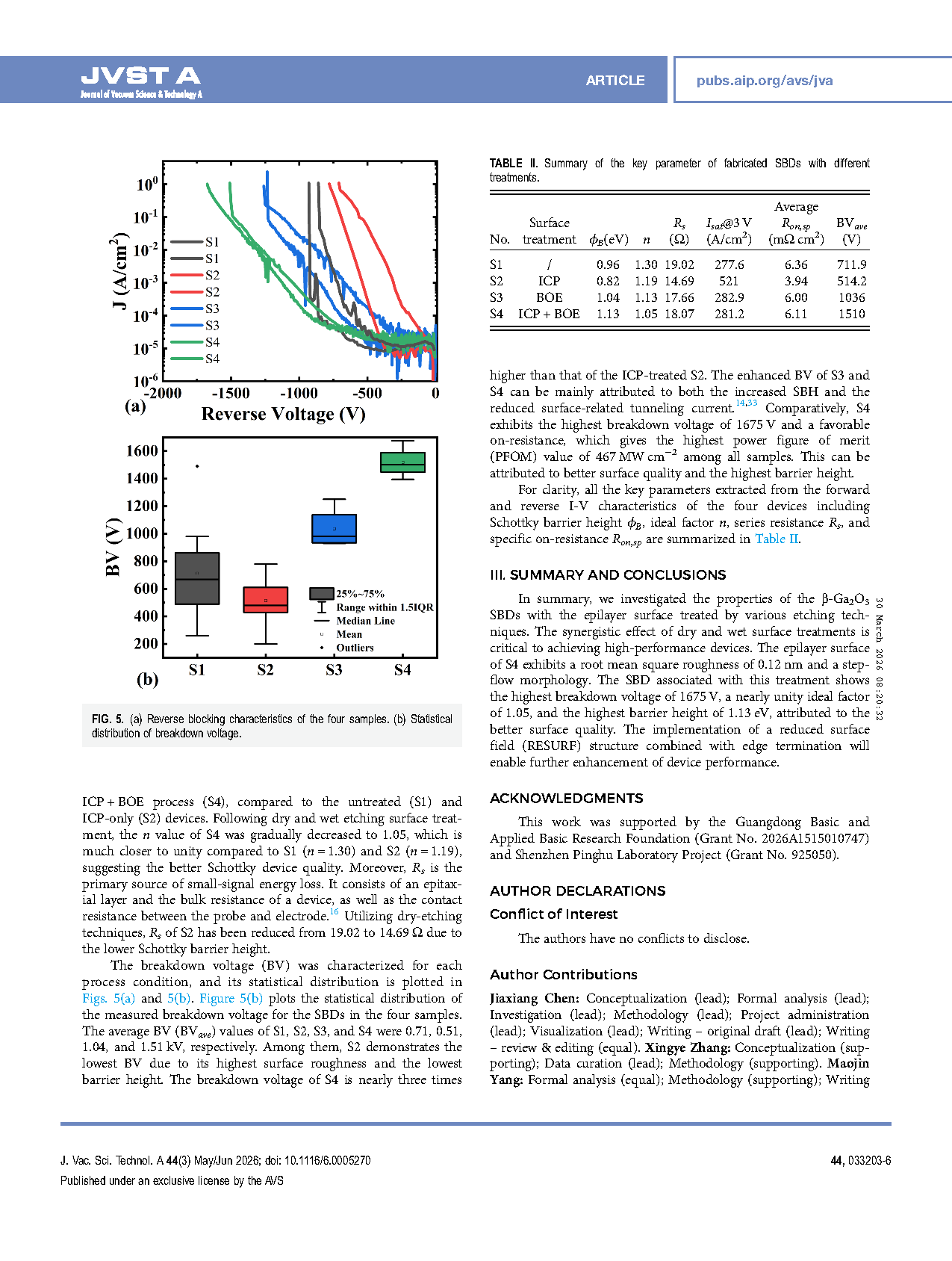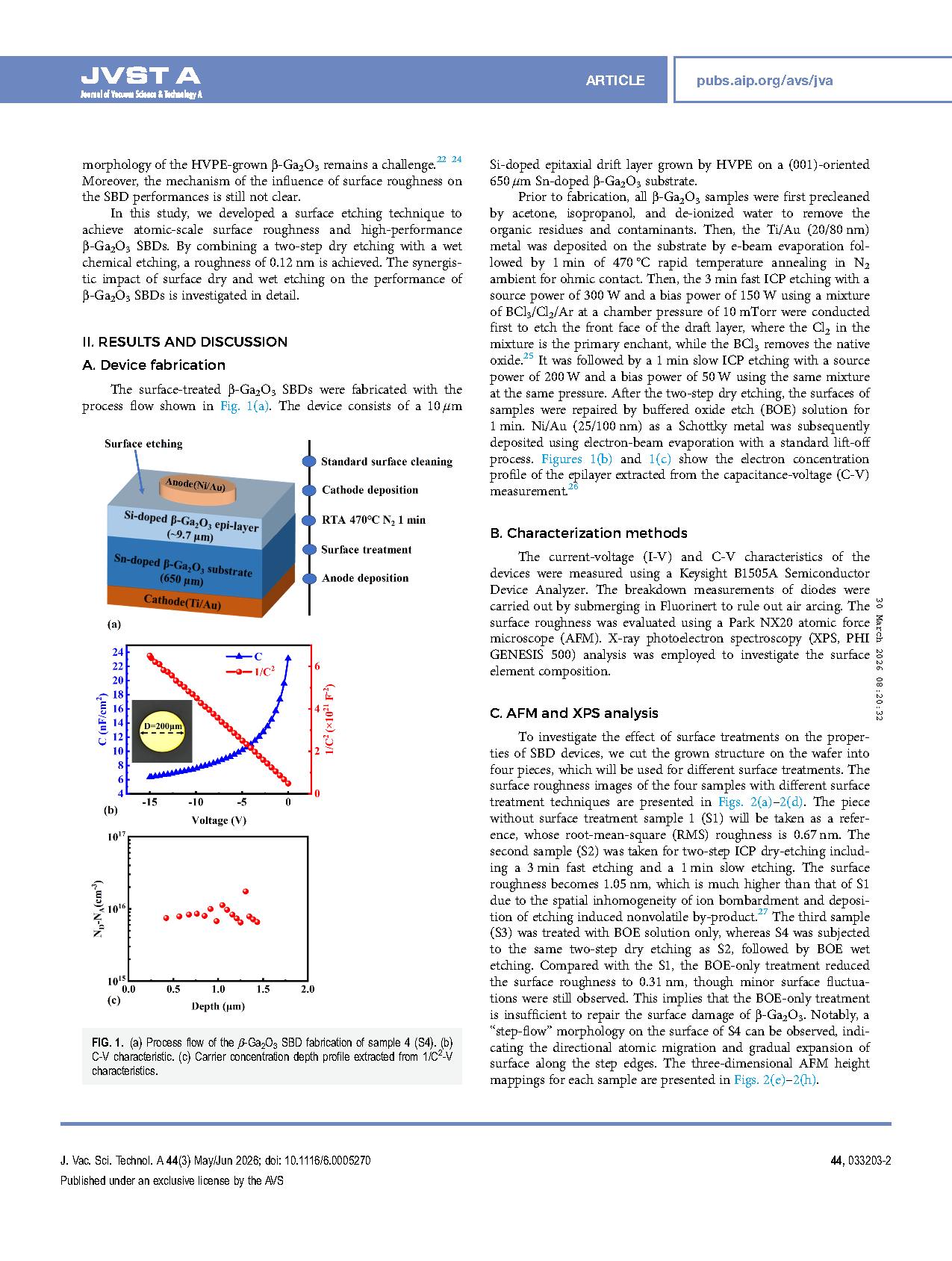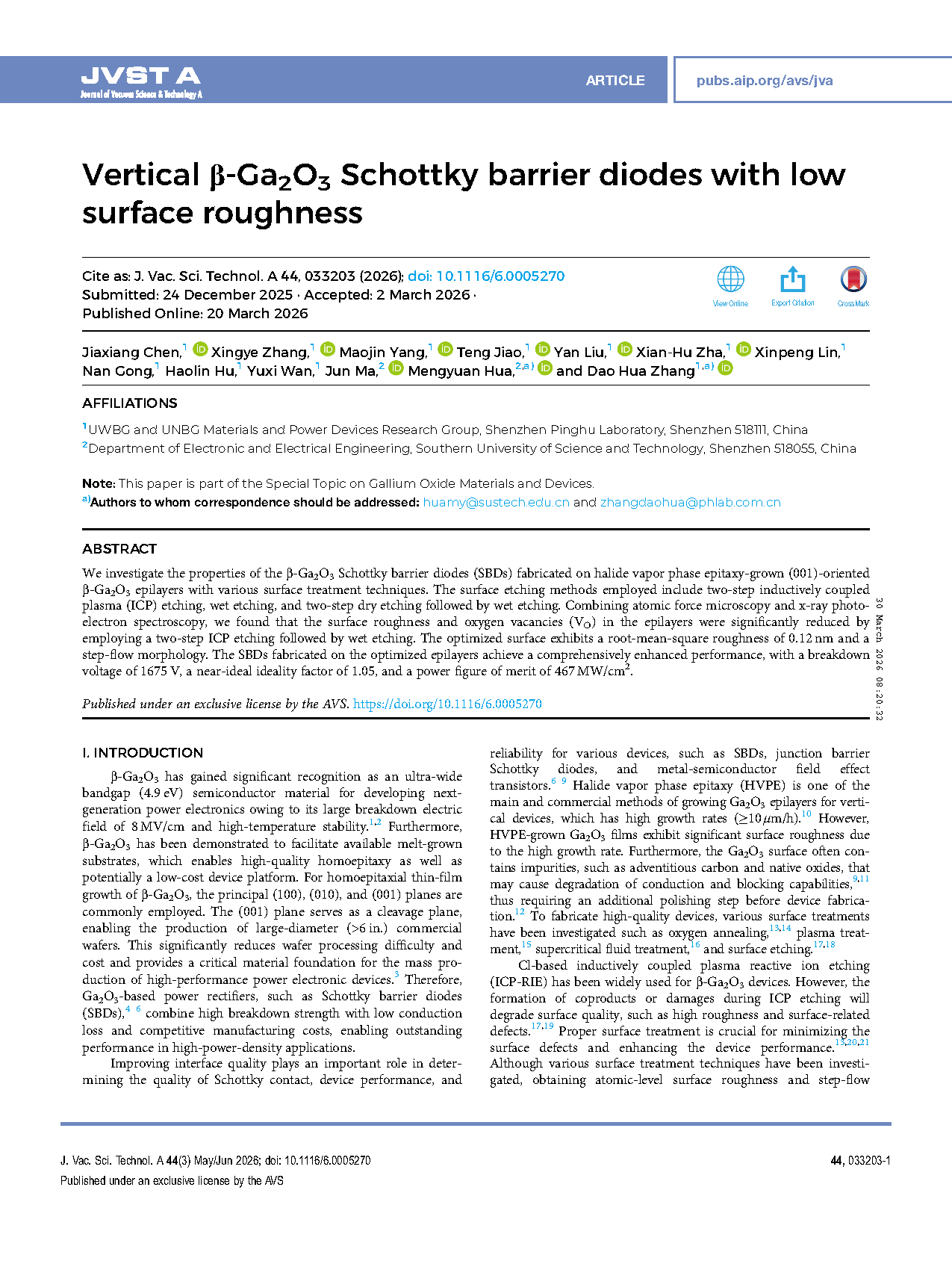 由深圳平湖实验室张道华院士、万玉喜主任和南方科技大学化梦媛研究员的研究团队在学术期刊 Journal Of Vacuum Science & Technology A 发布了一篇名为 Vertical β-Ga₂O₃ Schottky barrier diodes with low surface roughness(具有低表面粗糙度的垂直 β-Ga₂O₃ 肖特基势垒二极管)的文章。陈嘉祥博士是该文的第一作者。