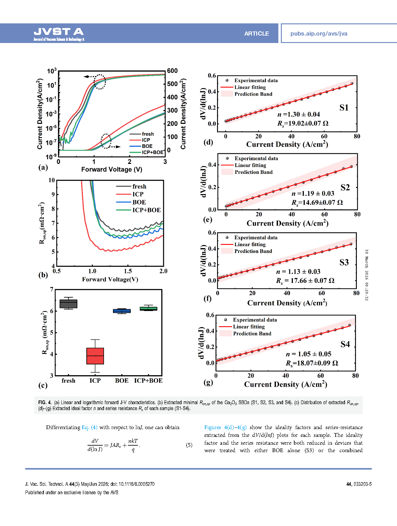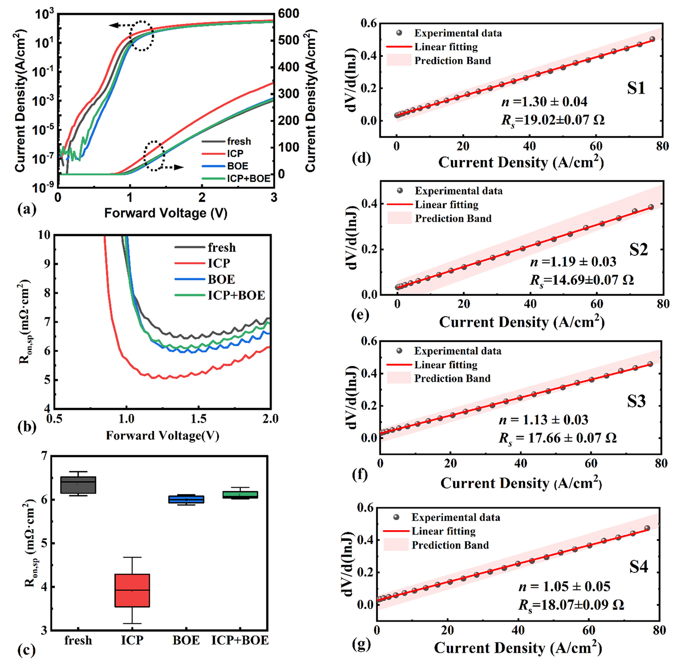 图4. (a)线性与对数正向 J - V 特性。(b)提取的 Ga₂O₃ 肖特基二极管(S1、S2、S3和S4)的最小导通电阻 Ron,sp。(c)提取的导通电阻 Ron,sp 的分布。(d)–(g)提取每个样品(S1-S4)的理想因子 n 和串联电阻 Rs。