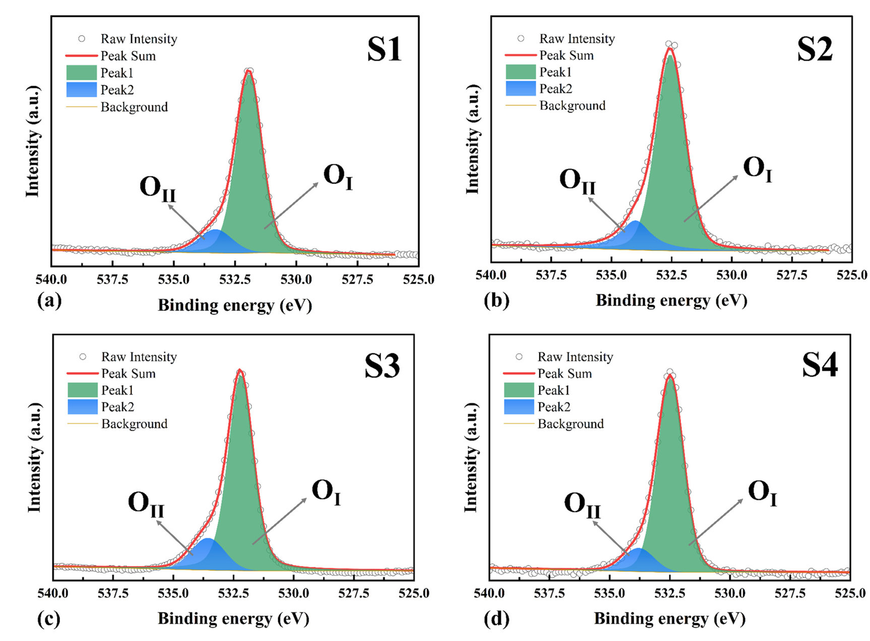 图3. XPS 光谱中样品(a)S1 (14.3 %)、(b)S2 (17 %)、(c)S3 (13.2 %)和(d)S4 (11.6 %)的 OII/(OI + OII)面积比变化。