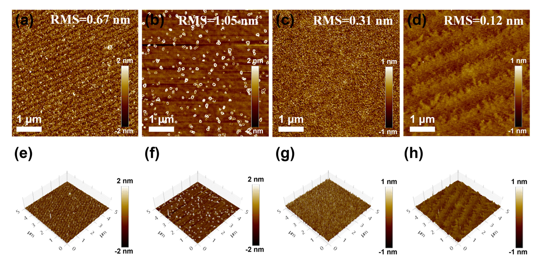 图2. 5×5 μm2 区域的原子力显微镜(AFM)图像,展示了 β-Ga₂O₃ 样品的表面粗糙度和形貌:(a)未经处理的 S1,(b)仅经过两步感应耦合等离子体(ICP)干法刻蚀的 S2,(c)仅经过 BOE 处理的 S3,以及(d)经过两步干法刻蚀加湿法处理的 S4。(e)–(h)S1 - S4 的三维 AFM 成像。