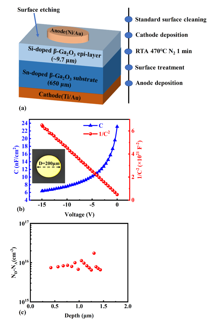 图1. (a)样品 4(S4)的 β-Ga₂O₃ 肖特基二极管(SBD)制造工艺流程。 (b)C-V 特性。 (c)从 1/C2-V 特性中提取的载流子浓度深度分布。