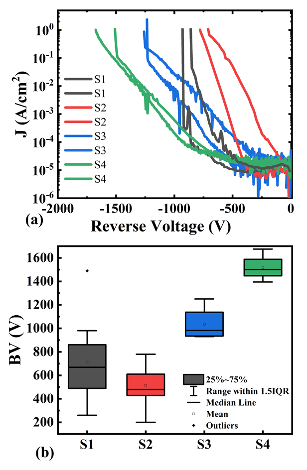 图5. (a)四个样品的反向阻断特性。 (b)击穿电压的统计分布。