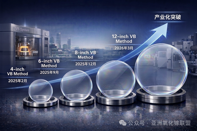 2025年初,富加镓业实现4英寸VB法氧化镓单晶的稳定生长,并同步推出自主生长装备与工艺体系,使晶体生长具备可重复性。此后,公司连续突破尺寸限制:2025年9月首次制备6英寸VB法单晶,12月联合中国科学院上海光机所实现8英寸晶体生长,至2026年3月成功制备全球首颗12英寸氧化镓单晶。从4英寸到12英寸,不是简单的尺寸放大,而是设备制造、热场设计、晶体生长稳定性、应力控制等每一个环节的工程能力的极限考验。标志着材料从科研样品向产业化制造的关键跃迁。