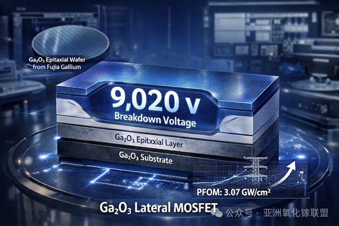 2026年3月31日,九峰山实验室发布消息,其研制的氧化镓横向MOSFET实现超过9000V(实测9.02kV)的击穿电压。在行业普遍水平仍停留在4000V以下的背景下,这一成果实现了显著跨越。