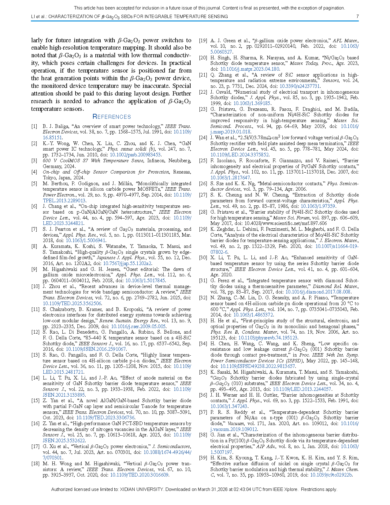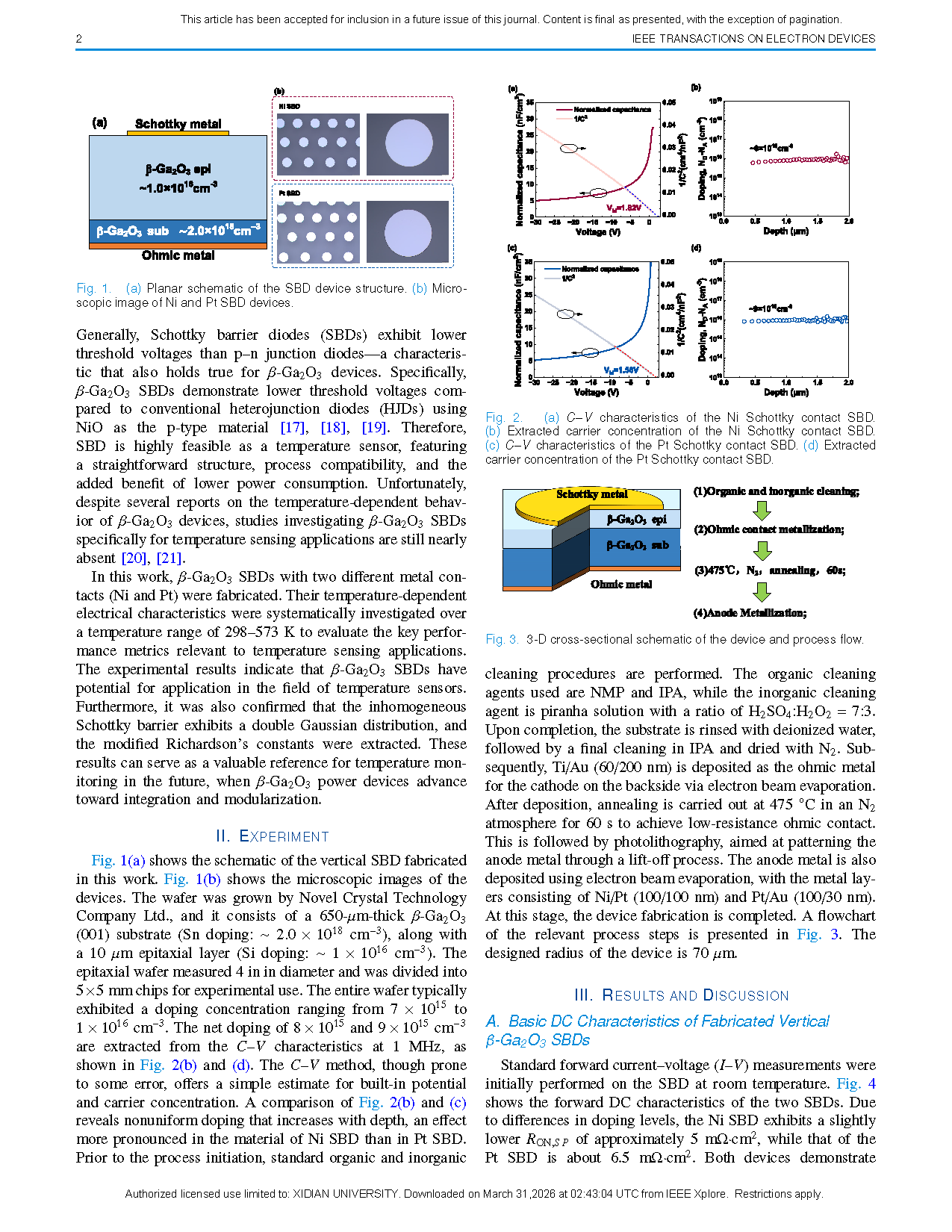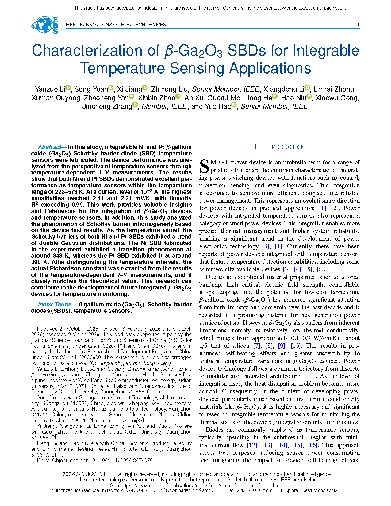 由西安电子科技大学郝跃院士、张进成教授的研究团队在学术期刊IEEE Transactions on Electron Devices发布了一篇名为Characterization of β-Ga₂O₃ SBDs for Integrable Temperature Sensing Applications(用于可集成温度传感应用的β-Ga₂O₃肖特基二极管的表征与性能分析)的文章。