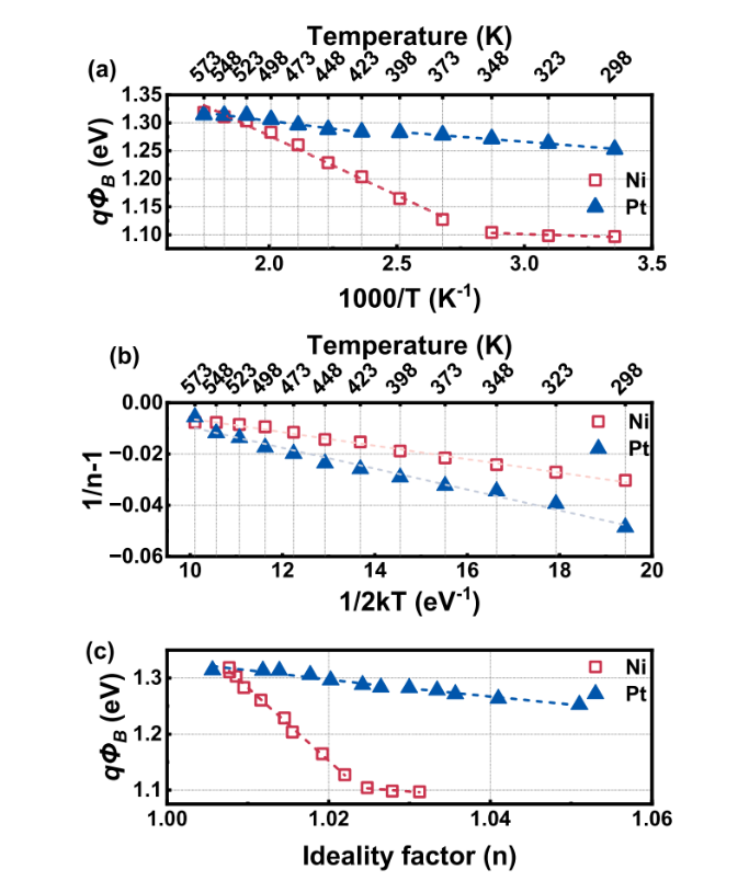 本文制备并表征了 Ni、Pt 垂直结构 β-Ga₂O₃ SBD,经变温 I–V 测试分析肖特基势垒参数,证实势垒不均匀性呈双高斯分布,通过温度分区精准修正了理查森常数。从温度传感角度,两种器件在 298–573 K、10⁻⁸ A 条件下均具备高灵敏度与高线性度(Ni:2.41 mV/K,R²=0.99955;Pt:2.21 mV/K,R²=0.99946)。Ni SBD 灵敏度更高、势垒均匀性更好;Pt SBD 高温下势垒变化更小,高温稳定性更优。