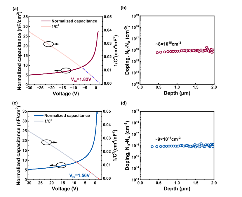 图 2. (a) 镍基肖特基接触型肖特基势垒二极管的电容 - 电压特性;(b) 镍基肖特基接触型肖特基势垒二极管的提取载流子浓度;(c) 铂基肖特基接触型肖特基势垒二极管的电容 - 电压特性;(d) 铂基肖特基接触型肖特基势垒二极管的提取载流子浓度。