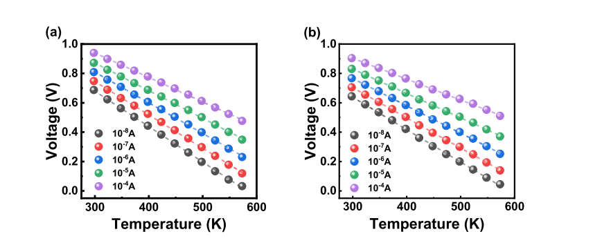 图 7. (a) 镍 /β‑氧化镓、(b) 铂 /β‑氧化镓肖特基势垒二极管温度传感器在恒定电流下的正向电压随温度变化曲线。