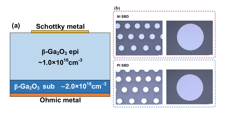 图 1. (a) 肖特基势垒二极管器件结构的平面示意图;(b) 镍基和铂基肖特基势垒二极管器件的显微图像。