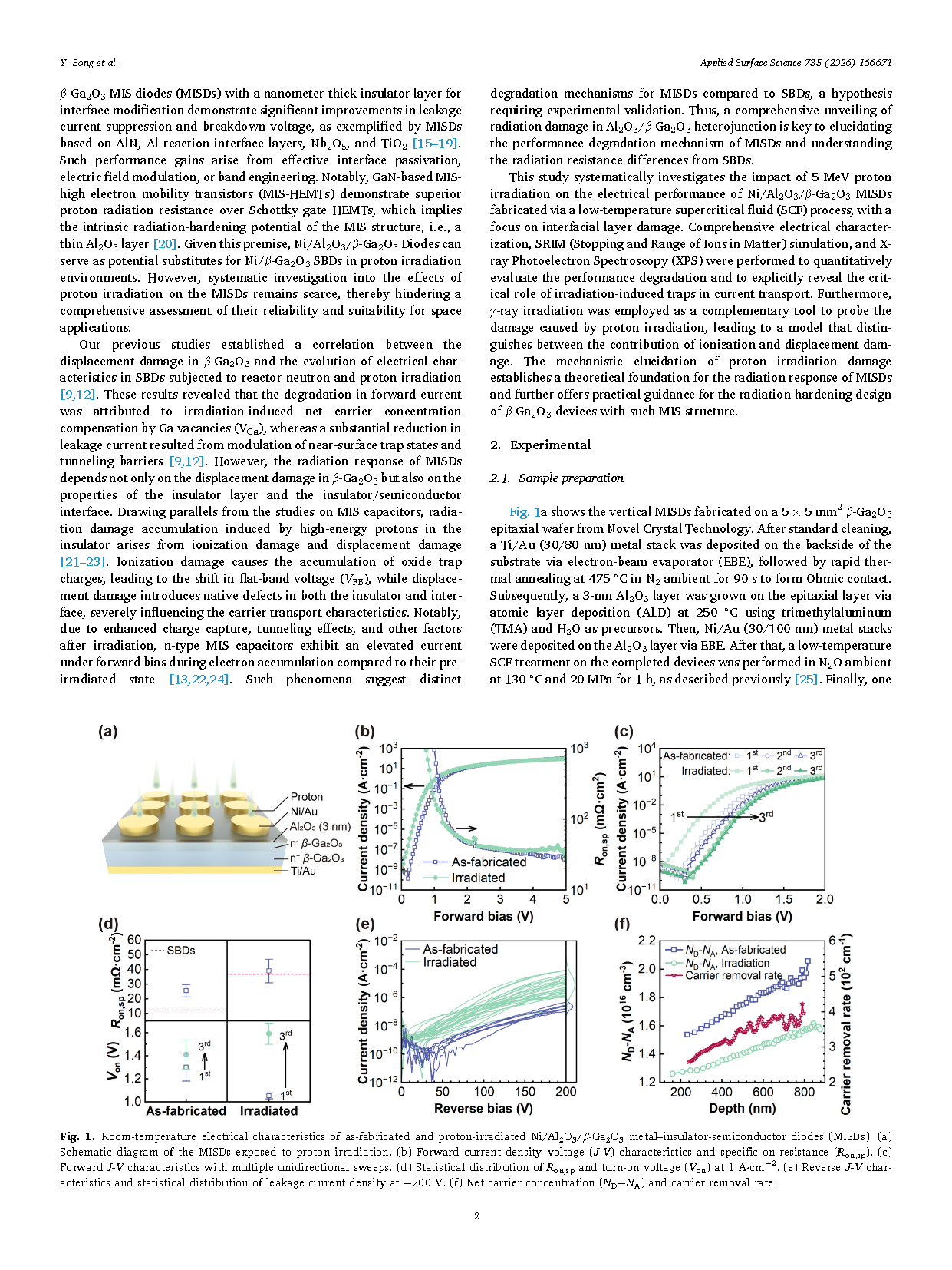 空间环境中普遍存在的高能质子极易诱发严重的位移损伤与单粒子效应,对β-Ga2O3器件的可靠性构成严峻挑战。因此,发展具有抗辐照能力的高性能β-Ga2O3器件,并揭示质子辐照对器件性能的影响机制,是当前β-Ga2O3器件应用与抗辐照加固设计中亟待深入探究的核心问题。β-Ga2O3器件的电学特性与抗辐照性能受异质结终端设计的影响。相较于肖特基势垒二极管(SBDs),采用纳米级绝缘层进行界面修饰的β-Ga2O3金属-绝缘体-半导体二极管(MISDs)在降低漏电流与提升击穿电压方面展现出显著优势,例如基于AlN、Al反应界面层、Nb2O5及TiO2的MISDs。值得注意的是,GaN基MIS-高电子迁移率晶体管(MIS-HEMTs)相较于常规HEMTs表现出更优的质子辐照耐受性,这暗示了该MIS结构(即薄层Al2O3)具有抗辐照潜力。然而,关于质子辐照对β-Ga2O3 MISDs影响的系统性研究仍鲜有报道。