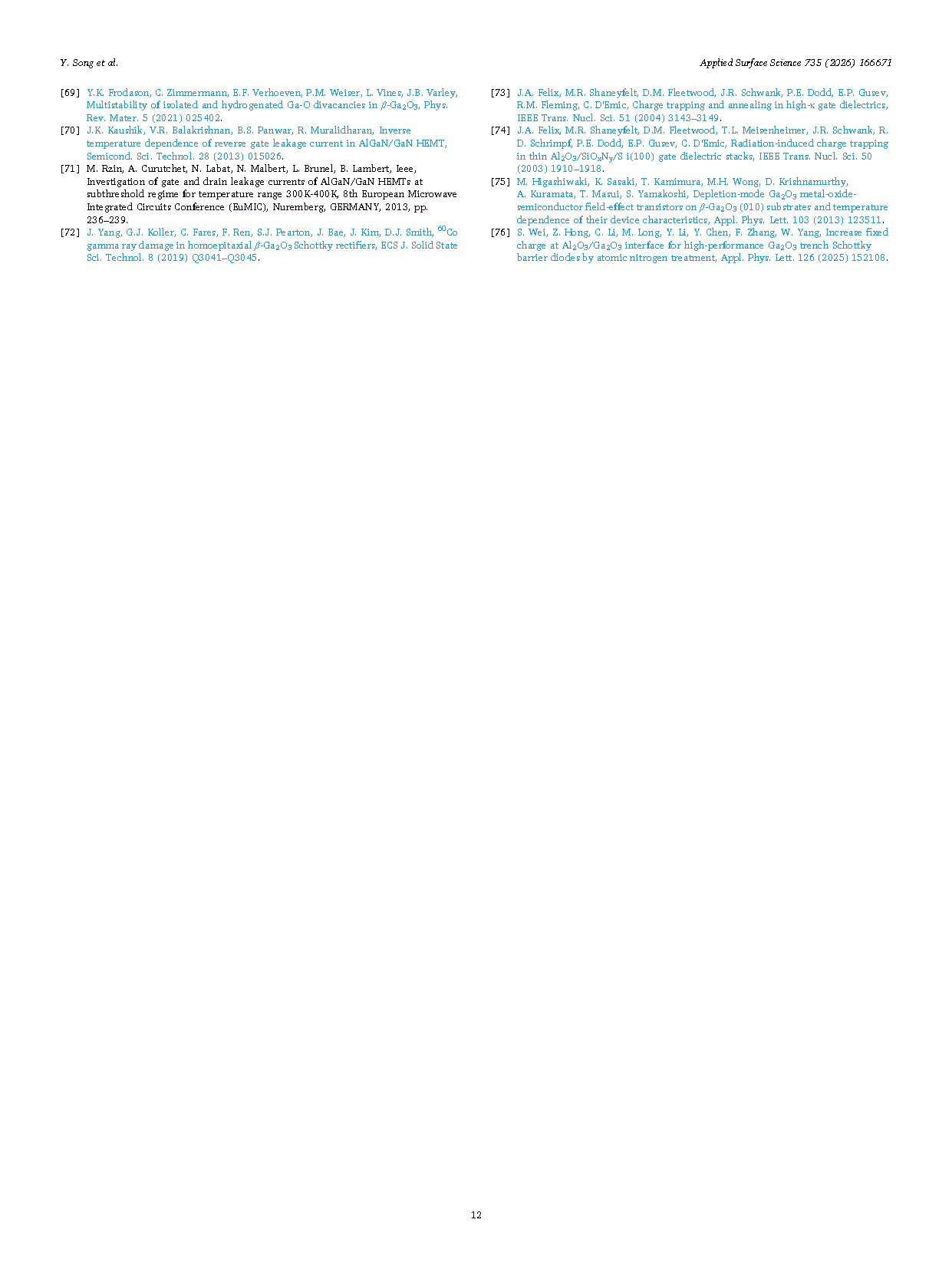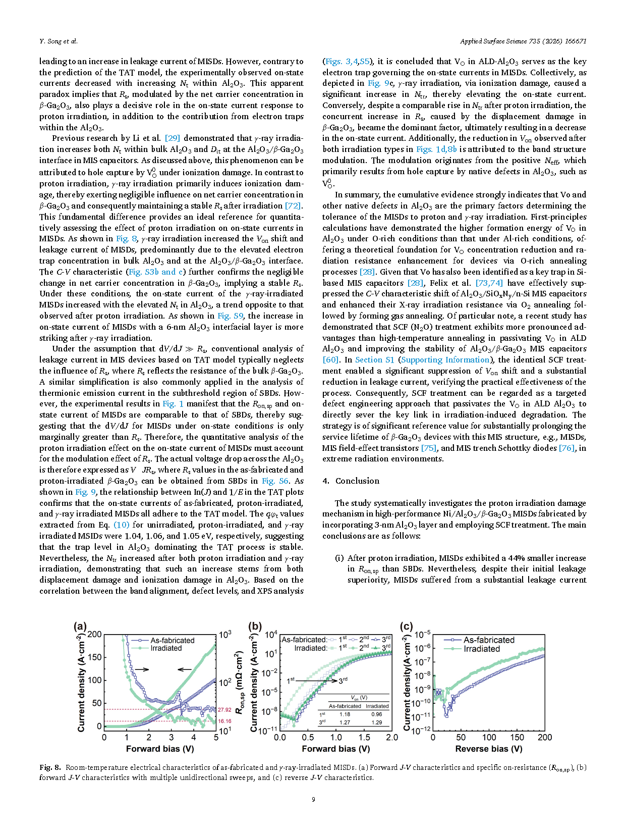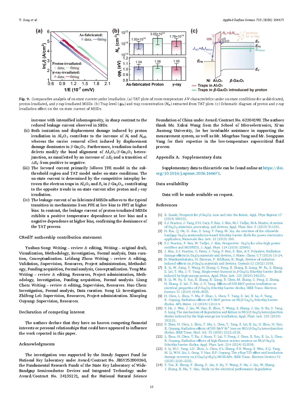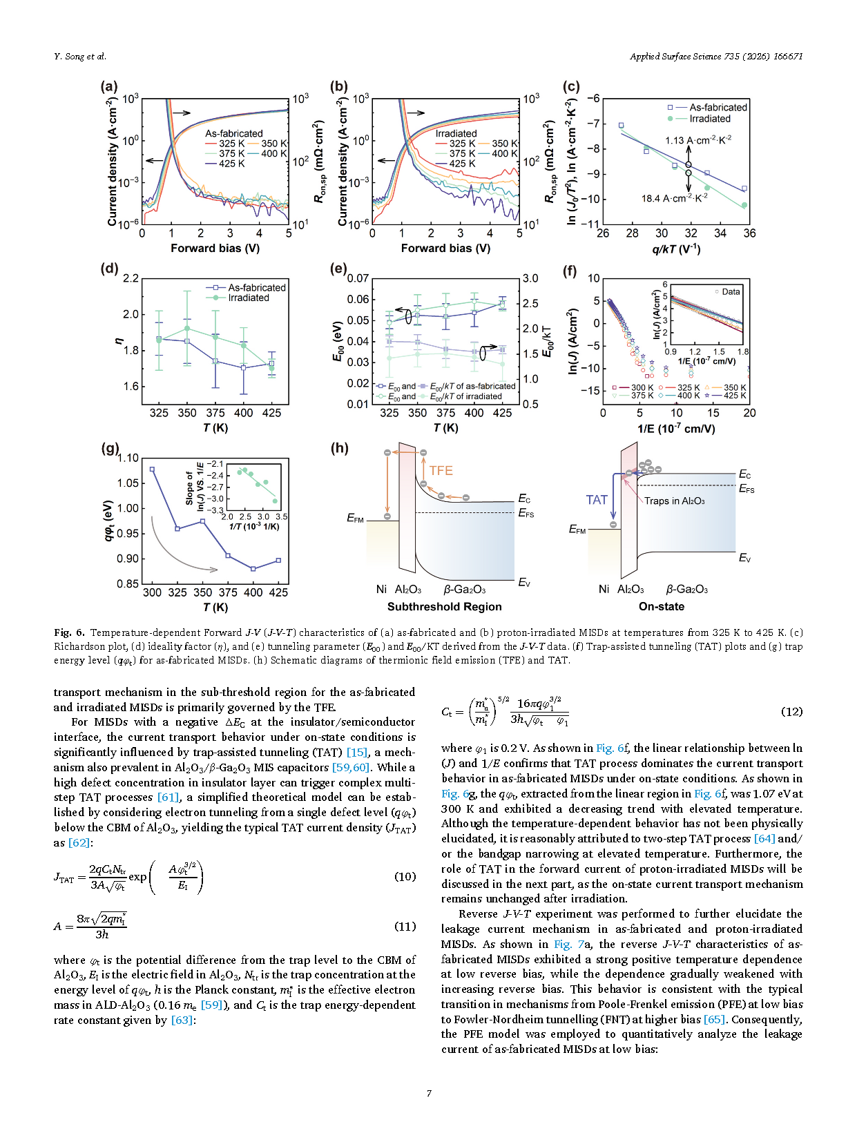 (iii)正向电流在亚阈值区主要遵循热电子-场发射模型,在开态条件下遵循陷阱辅助隧穿(TAT)模型。开态电流由Al2O3中电子陷阱与β-Ga2O3中串联电阻之间的竞争关系决定,这导致质子和γ射线辐照后开态电流呈现相反的变化趋势。