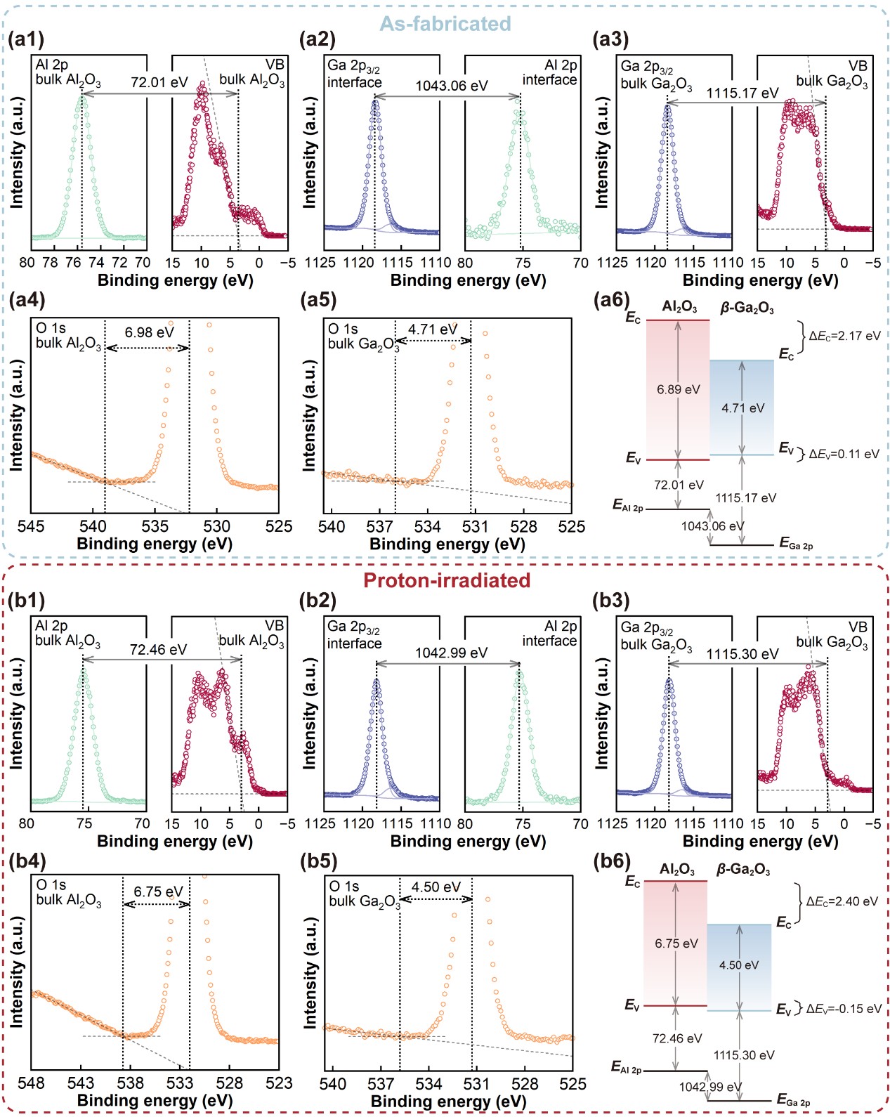 图4. 质子辐照前后Al2O3/β-Ga2O3异质结的能带对齐。(a1,b1)Al2O3的Al 2p谱和价带顶(VBM)。(a2,b2)Al2O3/β-Ga2O3界面的Ga 2p3/2和Al 2p谱。(a3,b3)β-Ga2O3的Ga 2p3/2谱和VBM。(a4,b4)Al2O3和(a5,b5)β-Ga2O3的O 1s谱。(a6,b6)Al2O3/β-Ga2O3界面能带对齐示意图。