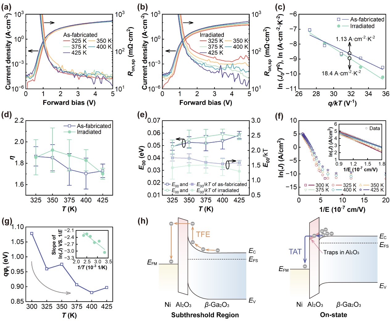 图6.(a)辐照前与(b)质子辐照后,MISDs在325-425 K温度范围内的正向J-V-T特性。(c)理查逊曲线,(d)理想因子(η),(e)隧穿参数(E00)及E00/kT。(f)质子辐照前MISD的陷阱辅助隧穿(TAT)曲线与(g)陷阱能级(qφt)。(h)热电子-场发射(TFE)与TAT的示意图。