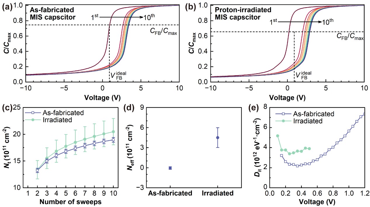 图5. Al2O3/β-Ga2O3异质结的陷阱分析。(a)辐照前和(b)质子辐照后,具有50 nm Al2O3层的MIS电容器的C-V特性。(c)电子陷阱密度(Nt),(d)有效氧化层电荷密度(Neff)和(e)界面态密度(Dit)。