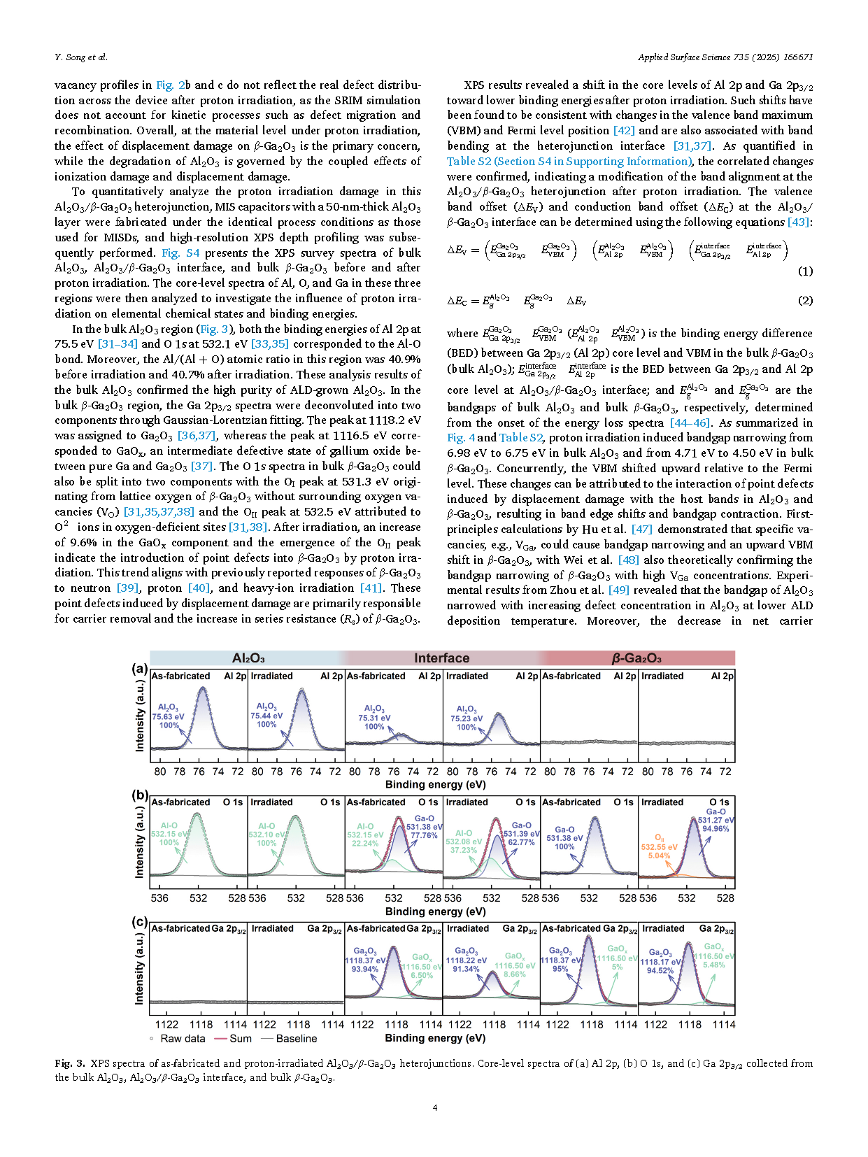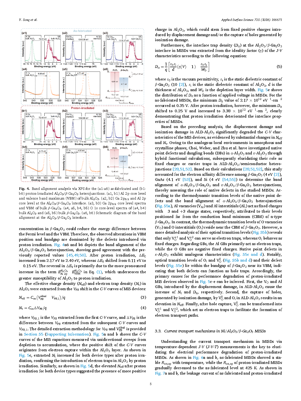 (ii)质子辐照在Al2O3中诱发的电离损伤和位移损伤共同导致了电子陷阱密度和有效电荷密度的增加,而β-Ga2O3中则以位移损伤引起的载流子去除效应主导。此外,辐照诱导的缺陷改变了Al2O3/β-Ga2O3异质结的能带对齐,表现为导带带偏增大以及价带带偏由正转负。