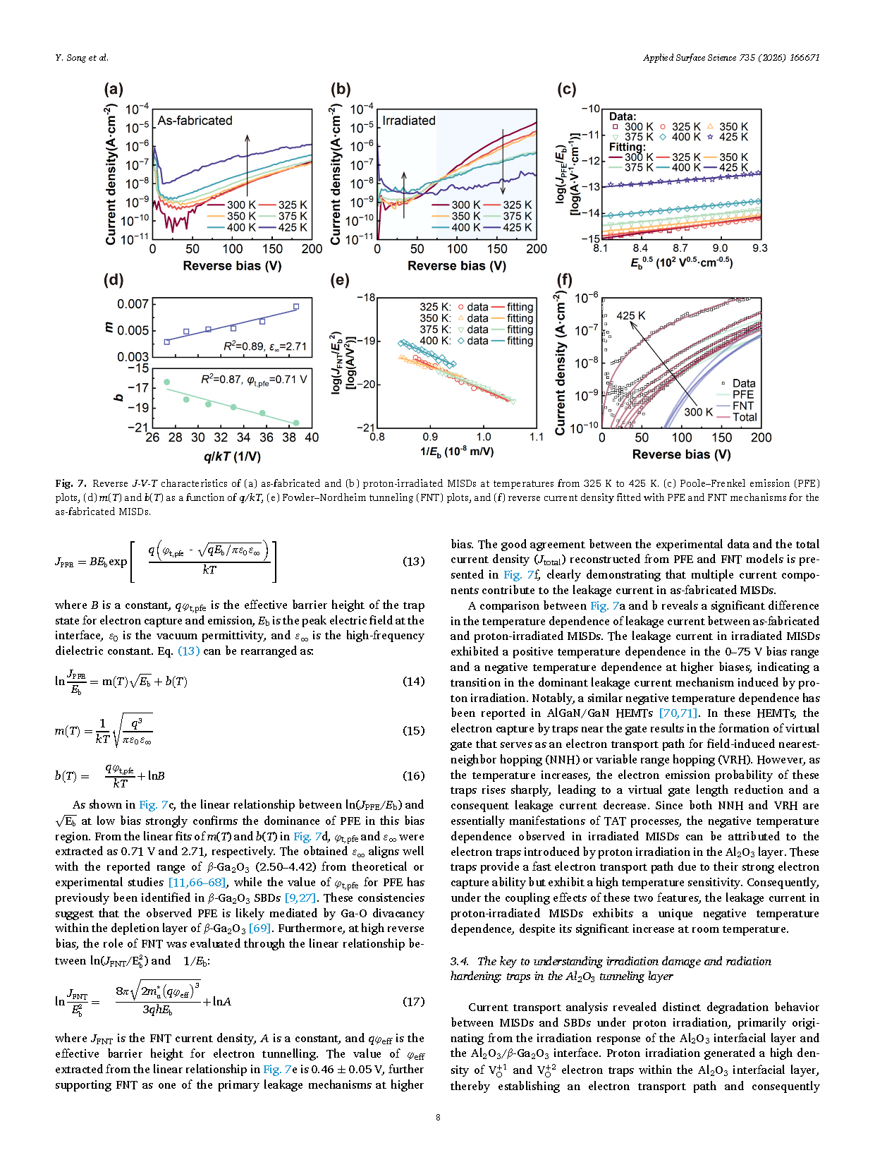 (iv)未辐照MISD的漏电流符合从低偏压下Poole-Frenkel发射到高偏压下Fowler-Nordheim隧穿的机制转变。相比之下,质子辐照后MISDs的漏电流在低偏压下呈现正温度依赖性,在高偏压下呈现负温度依赖性,证实了TAT过程的主导地位。