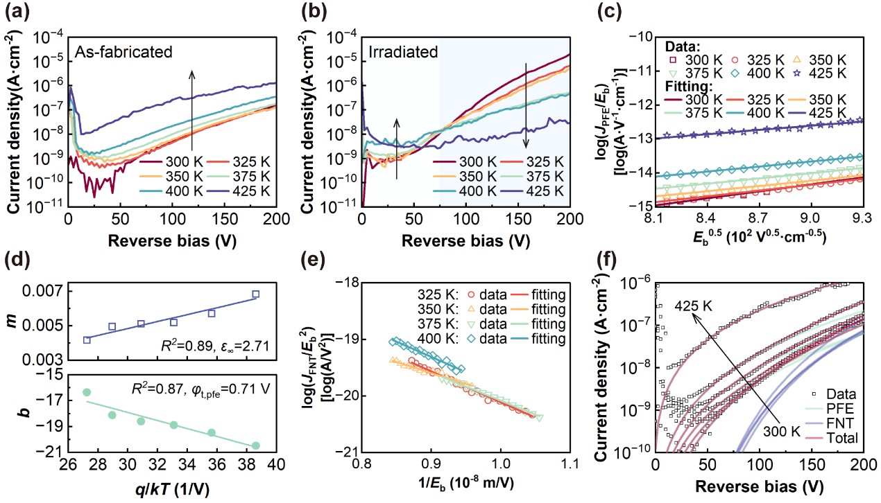 图7. (a)辐照前与(b)质子辐照后,MISDs在300-425 K温度范围内的反向J-V-T特性。辐照前MISDs反向电流密度的(c)Poole‑Frenkel发射曲线,(d)m(T)与b(T)随q/kT的变化关系,(e)Fowler‑Nordheim隧穿曲线和(f)拟合图。