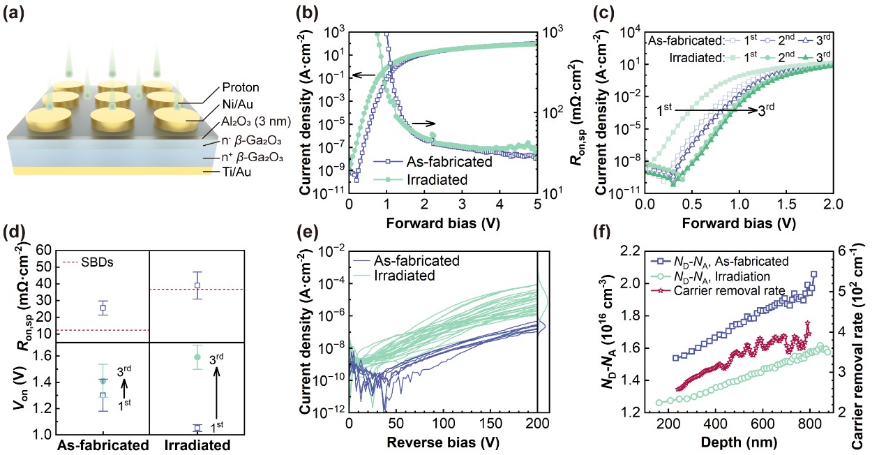 图1. 质子辐照前后Ni/Al2O3/β-Ga2O3 MISDs的室温电学特性。(a)MISDs结构示意图。(b)正向J-V特性及比导通电阻(Ron,sp)。(c)多次单向扫描的正向J-V特性。(d)Ron,sp与开启电压(Von)的统计分布。(e)反向J-V特性。(f)净载流子浓度与载流子去除率。