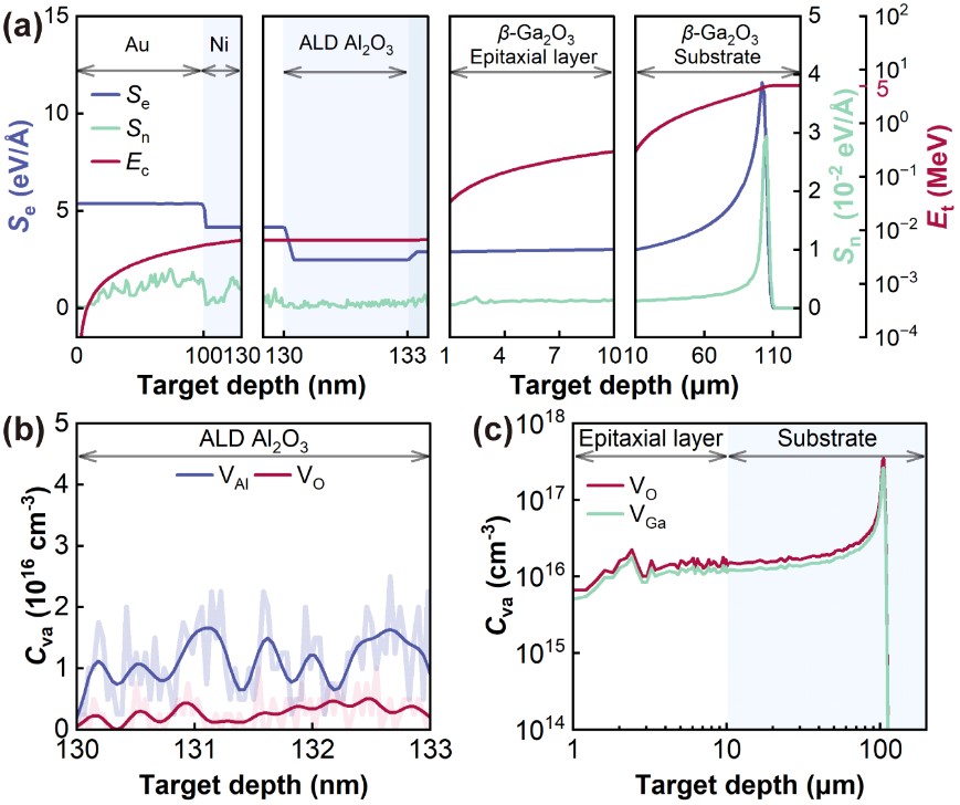 图2. SRIM模拟结果。(a)电子能损(Se)、核能损(Sn)及累积能量损失(Et)随深度的变化关系。(b)Al2O3和(c)β-Ga2O3中空位缺陷的分布