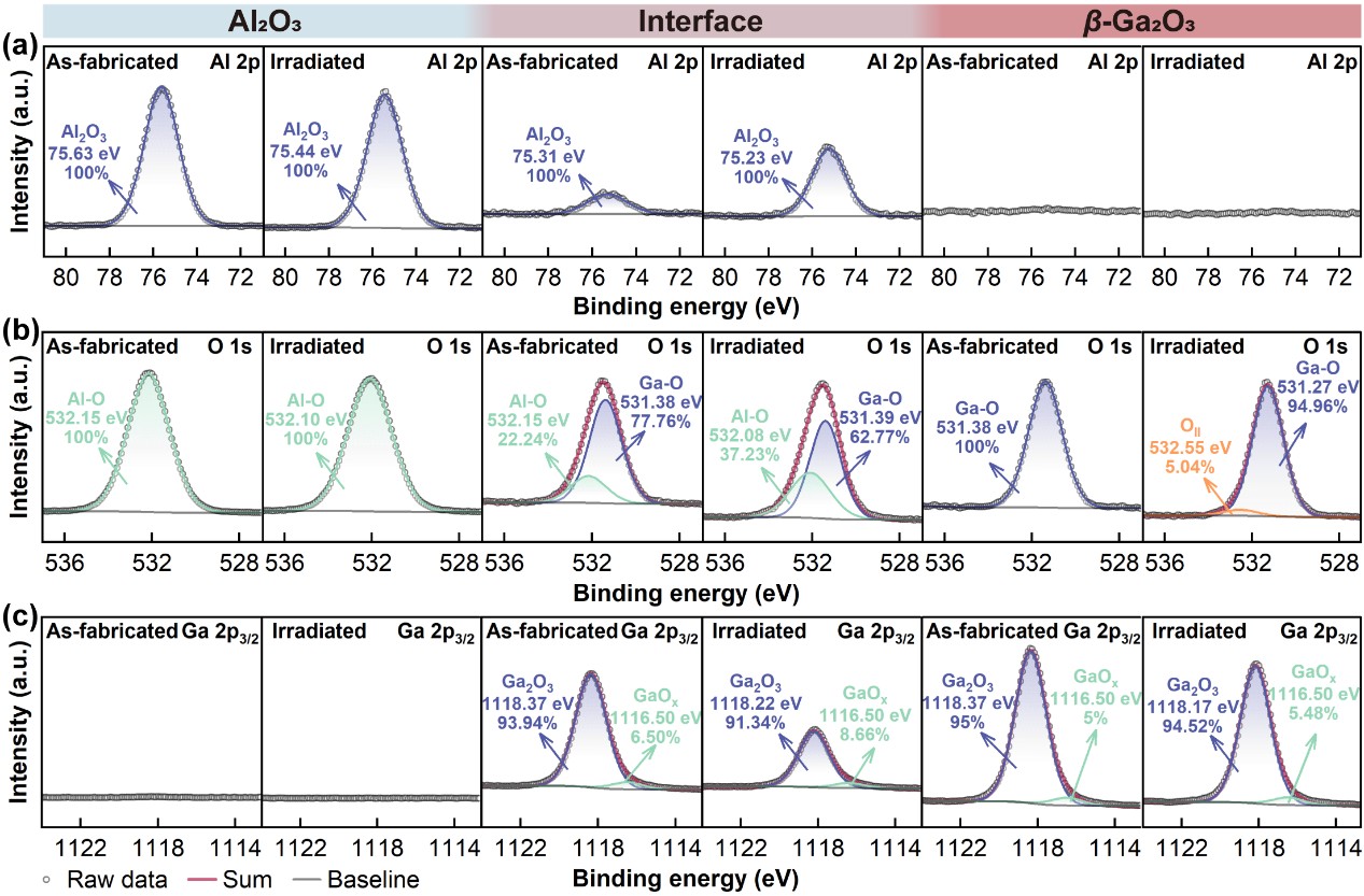 图3. 质子辐照前后Al2O3/β-Ga2O3异质结的XPS核心能级谱。(a)Al 2p谱、(b)O 1s谱和(c)Ga 2p3/2谱。