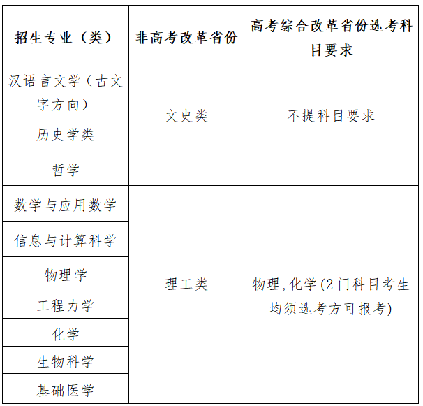 1.招生专业:汉语言文学(古文字方向)、历史学类(含历史学、考古学、文物与博物馆学专业)、哲学、数学与应用数学、信息与计算科学、物理学、工程力学、化学、生物科学、基础医学。