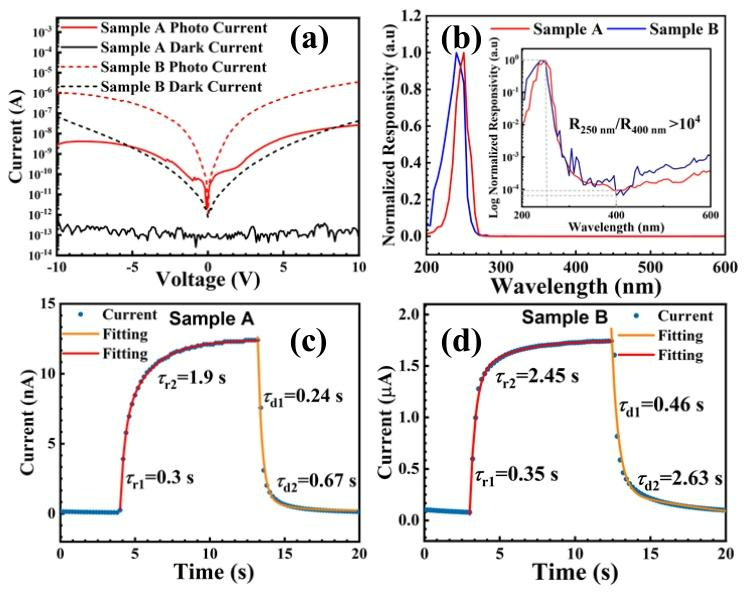 图 3 (a) 样品在暗态及 255 nm 紫外光照射下的电流 - 电压(I–V)特性曲线;(b) 样品的光谱响应特性;(c) 样品 A、(d) 样品 B 在 255 nm 紫外光激发下的电流上升与衰减过程拟合曲线。