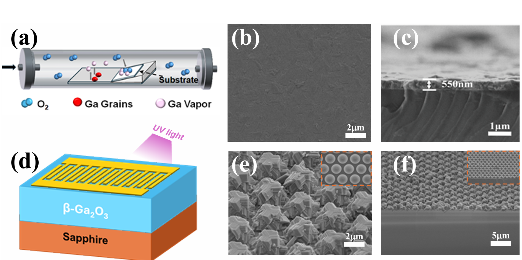 图 1 (a) β-Ga2O3 薄膜的化学气相沉积(CVD)系统及沉积工艺示意图;(b) 蓝宝石衬底、(e) 图形化蓝宝石衬底(PSS)上沉积的 β-Ga2O3 薄膜的俯视扫描电子显微镜(SEM)图像;(d) 所制备的 β-Ga2O3 紫外光电探测器的结构示意图;(c) 蓝宝石衬底、(f) 图形化蓝宝石衬底(PSS)上沉积的 β-Ga2O3 薄膜的截面扫描电子显微镜(SEM)图像。橙色虚线区域为原始图形化蓝宝石衬底(PSS)的扫描电子显微镜(SEM)图像。