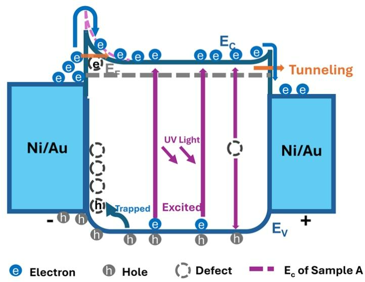 图 4 基于样品 B 的 β-Ga2O3 金属 - 半导体 - 金属(MSM)光电探测器的能带结构示意图。