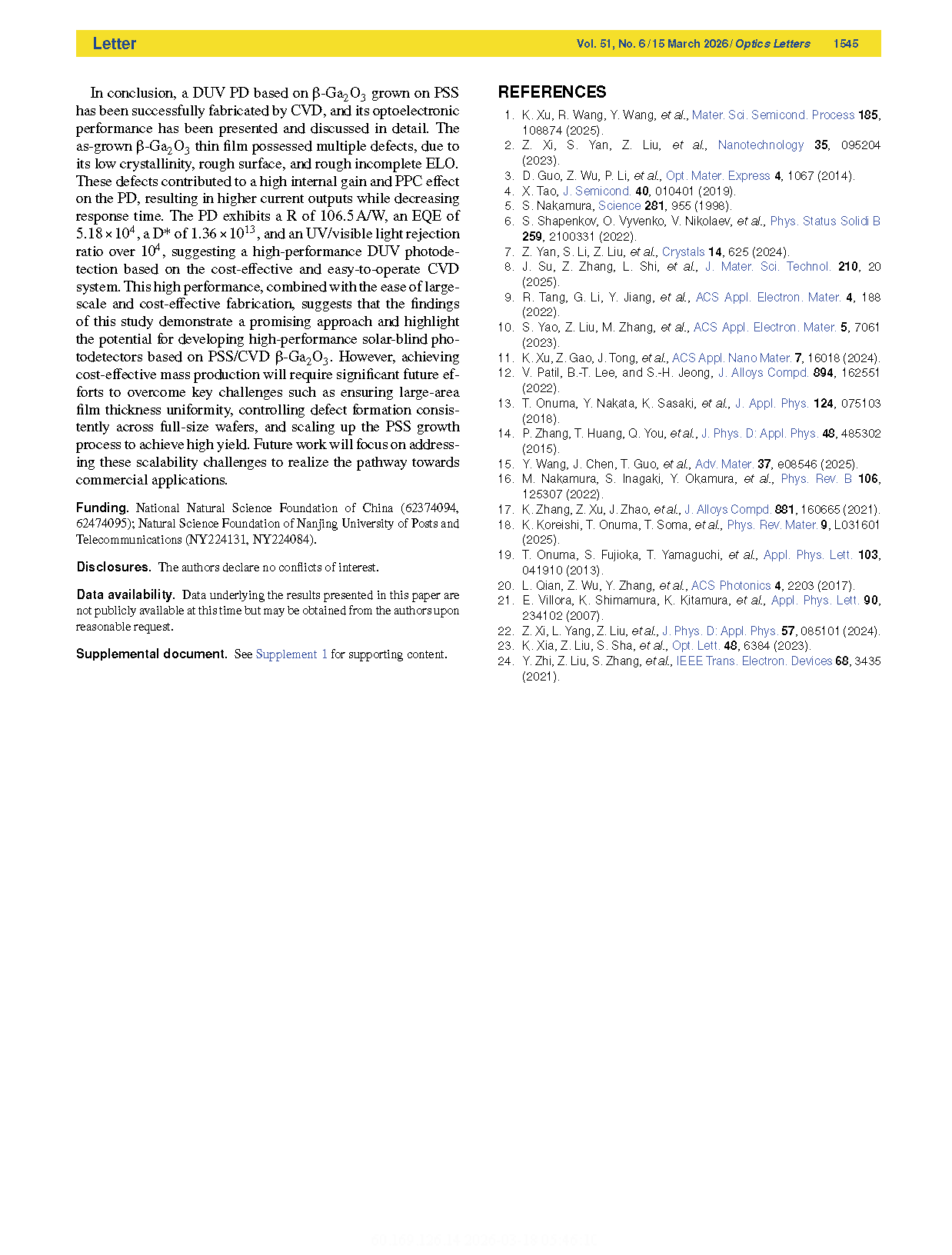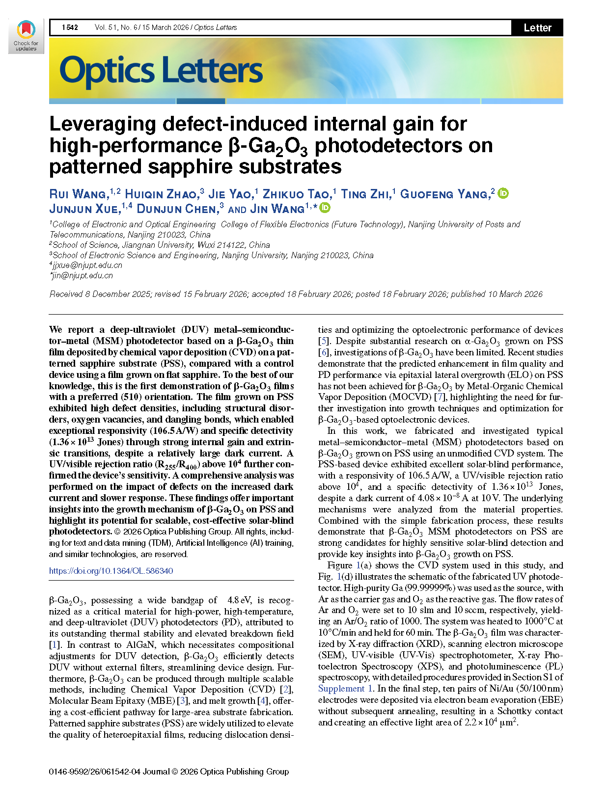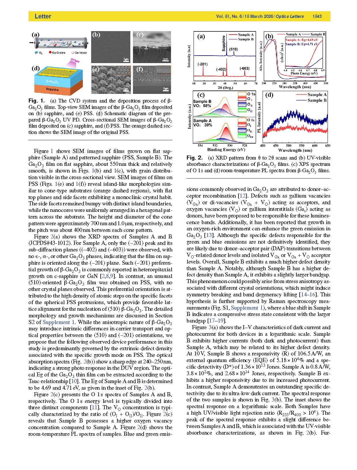 【会员论文】Optics Letters丨南京邮电大学:利用缺陷诱导内增益制备图形化蓝宝石衬底上的高性能β-Ga₂O₃光电探测器