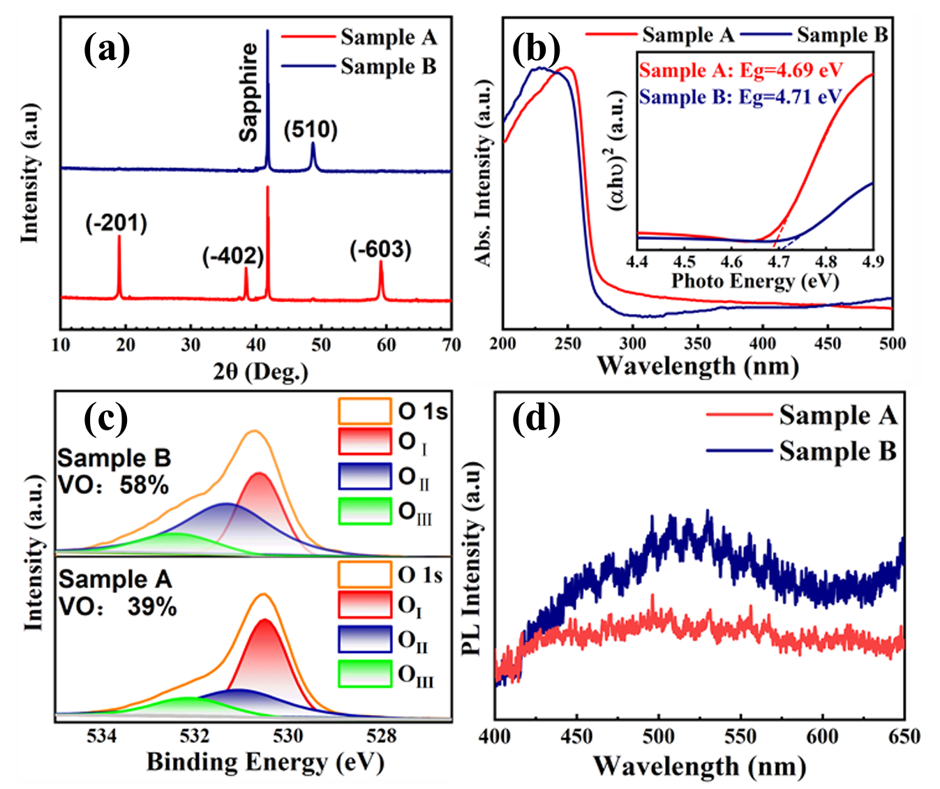 图 2 (a) β-Ga2O3 薄膜的 θ-2θ 扫描 X 射线衍射(XRD)图谱;(b) β-Ga2O3 薄膜的紫外 - 可见吸收特性表征结果;(c) β-Ga2O3 薄膜的氧 1s 光电子能谱(XPS)图;(d) β-Ga2O3 薄膜的室温光致发光(PL)光谱。