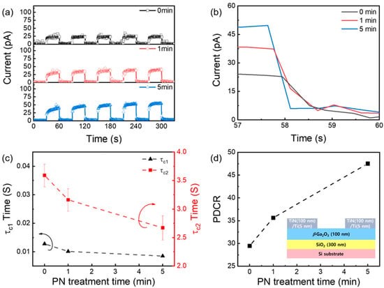 图3. (a) 瞬态光响应,(b) 典型光电流衰减曲线,(c) 两个光电流衰减时间常数(τc1和τc2), (d) 在不同PN处理时间下的β-Ga2O3 MSM PD的PDCR。插图中是MSM PD的示意横截面图。箭头表示每个轴。