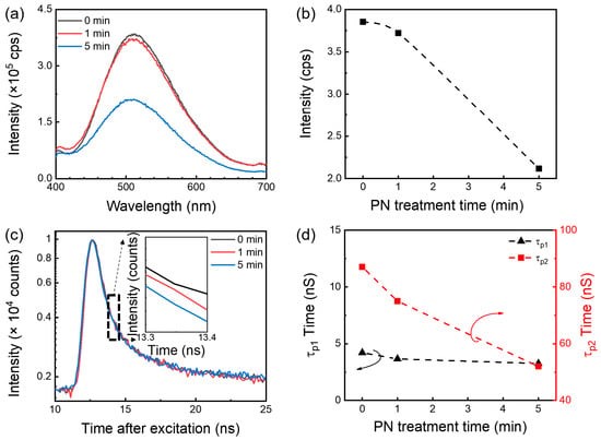 图2. 室温下,β-Ga2O3在不同PN时间下的(a)光致发光光谱和(b)峰值强度。在不同PN处理时间下,β-Ga2O3的(c) PL衰减剖面(在501 nm处)和(d)时间常数。箭头表示每个轴。