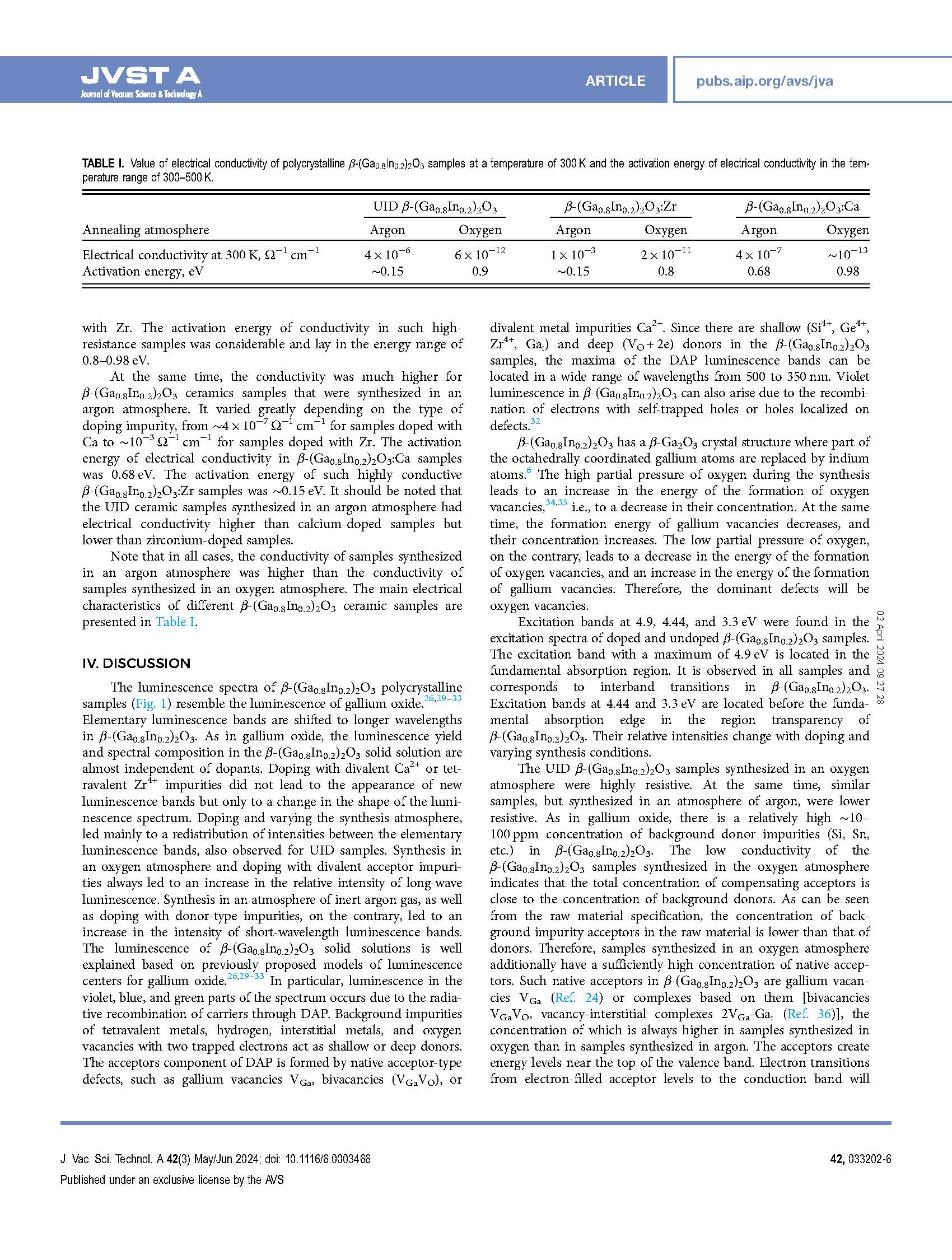 近期,由乌克兰利沃夫国立伊万弗兰科大学的研究团队在学术期刊《Journal of Vacuum Science & Technology A》发布了一篇名为Electrical conductivity, luminescence, and deep acceptor levels in β-Ga2O3-In2O3 polycrystalline solid solution doped with Zr4+ or Ca2+ ions (掺杂 Zr4+ 或 Ca2+ 离子的 β-Ga2O3-In2O3 多晶固溶体的导电性、发光和深受体水平)的文章。